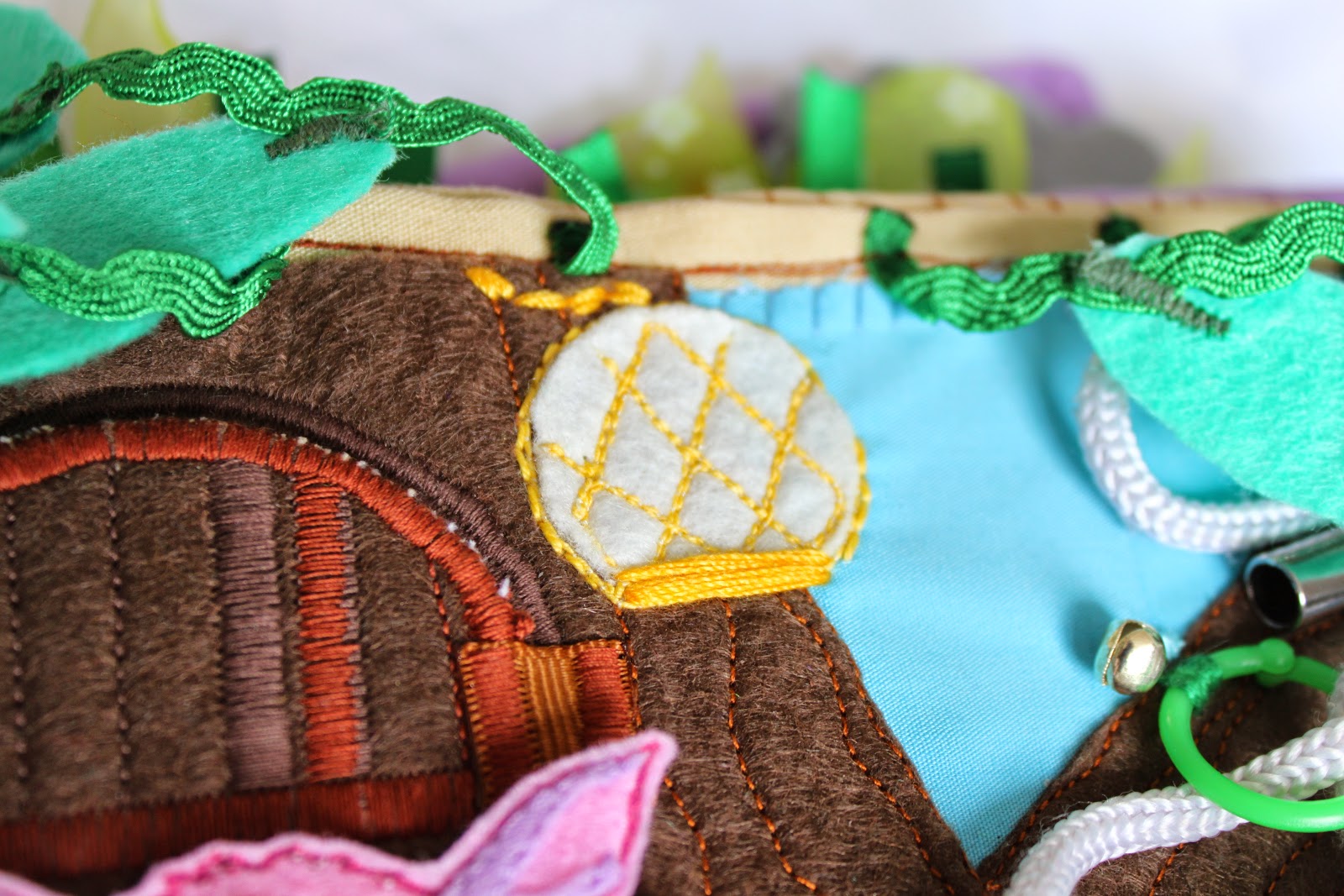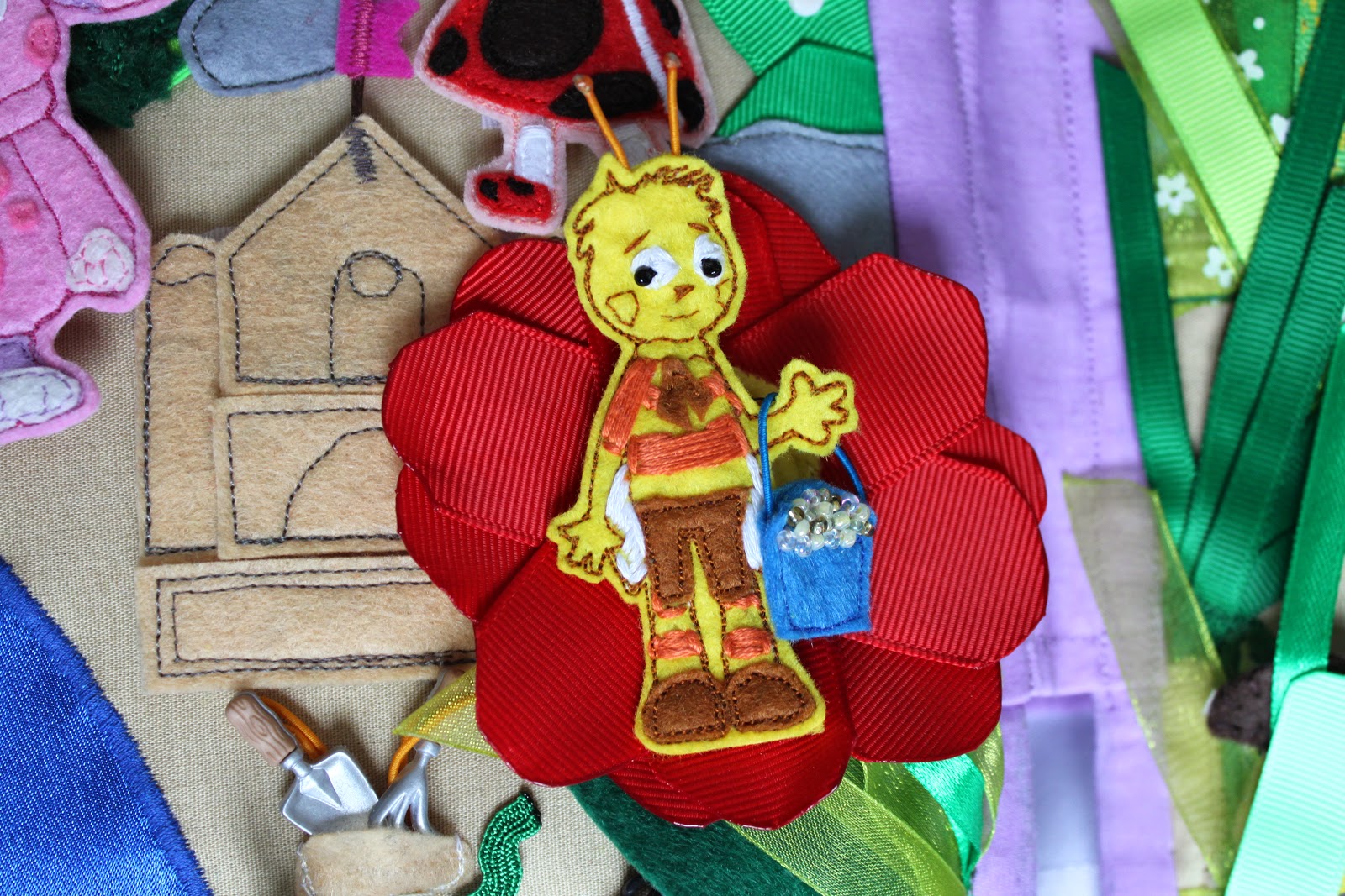 Тут можно отыскать лук! Он в кармашке растет. И тут же можно найти 3 корзины с обозначенными на них черникой, земляникой и грибочком. Задача все собрать в определенные корзины (сортер) и пересчитать. Ягоды на крючках (при чем крючки пришиты по-разному) а грибочек на кнопке. Изучаем ягоды и грибы, изучаем счет до 3х, сортируем урожай.