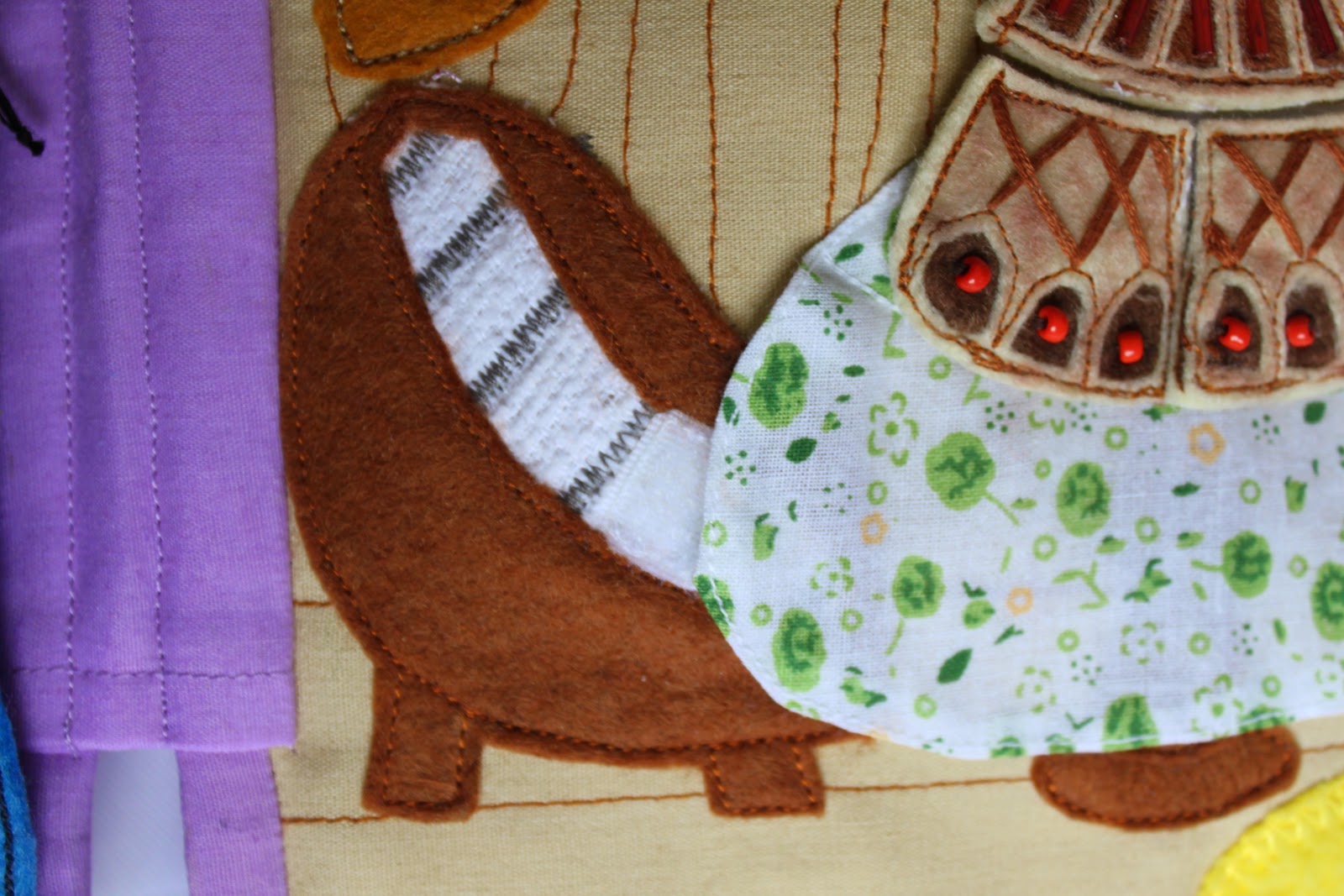 А тут у нас пирог - пазл на липучке, корзинка на полке съемная и пригодится для хранения элементов с последующих страниц ;) Картинку с пчелкой можно вытащить и поменять на другую картинку или фотографию, а может и на рисуночек хозяина книжки)) На кресле и на стуле есть липучки, можно сажать героев. Ковер состоит из разных цветов и материалов жесткого фетра и мягкого пушистого флиса.