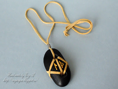 У нас теперь тоже поселился куриный бог. Игорь проделал дополнительную дырочку в камне, обвязал замшевым шнурком, чтобы можно было повесить на гвоздик))) или шею, и нанес руны Леля и Даждьбог.