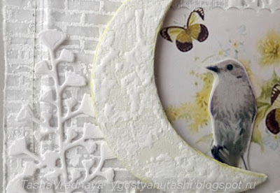 Месяц вырезала из гофрокартона, зашпаклевала, покрасила желтой краской. Потом через кружево нанесла белую акриловую краску, она, естественно, расплылась и получились такие вполне симпатичные " кратеры".