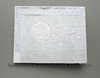 Прикупила белую пудру для эмбоссинга, хотелось использовать ее поскорее. В этой открыточке попробовала использовать ее на кальке. Получилась белая кирпичная стеночка и штампик на спиночке"ручная работа" тоже ей сделана.