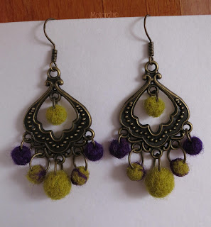 Маленькие шарики из шерсти и банановых нитей (фиолетовые) весело болтаются при каждом движении головой. Те, которые между зелеными и фиолетовыми, - попробовала сделать мраморными, но из-за крохотного размера это не совсем заметно =)