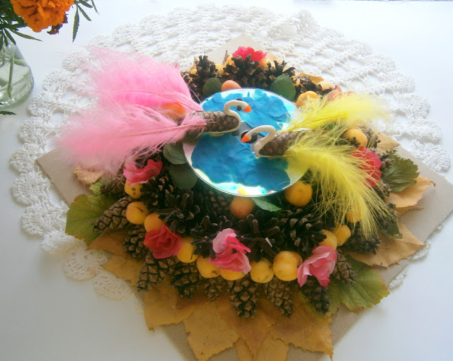 и за вечер мы с Алешей сделали осенний венок из шишек, листьев и яблочек.