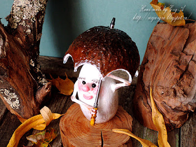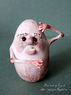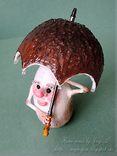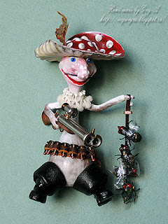 Вот он гриб во всей красе появился по росе, быстро осмотрелся, на пенёк уселся! В этот раз Игорь не фотографировал ход работы. Просто расскажу. Ножка: на проволочном скелете. утяжеленном к низу гайками, накручена лента для утепления окон для объема, потом все замазано полимерной глиной и сформировано лицо, затем акриловые краски и лак. Зонтик: купол вырезан из флакона от жидкого мыла, на который наклеен сверху и снизу та же утеплительная лента, спицы сделаны их шнура для детского плетения, все аокрашено акриловыми касками и покрыто лаком; ручка зонтика сделана из телескопичекой антенны, ручка из велосипедного нипеля на проволоке, покарашено и полачено. Все рельефные детальки гриба и зонтика выполнялись акриловым контуром