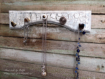 Покрасила дощечку коричневой красочкой, потом кракелюрный лак и белая краска. Фигурные торцы намылила и потерла))) Специально подобрала разномастные крючочки-кнопочки. В общем-то и всё!