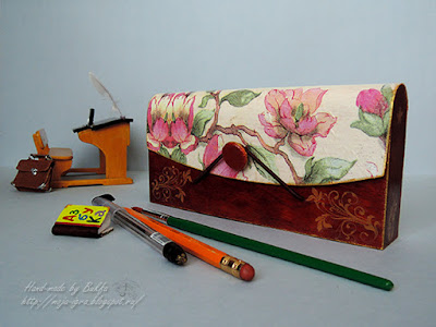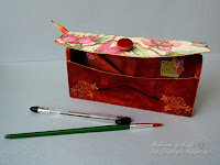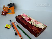 Получился вот такой красненький с золотыми узорами и цветочной крышкой пенал. Долго подбирала салфеточку на верхнюю крышку. Сначала хотела детскую картинку, но не нашлось по цвету и тону.