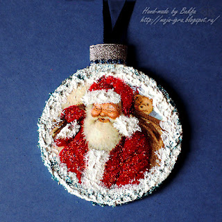 На заготовочках сделан простой декупаж: с одной стороны - разные салфеточки, с другой - скрап-карточки, которые я истончила с помощью скотча. Верхушки шариков обернута серебряной лентой с капельками контура.