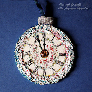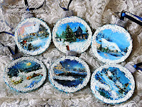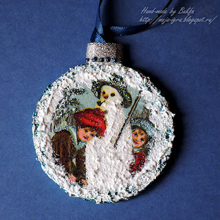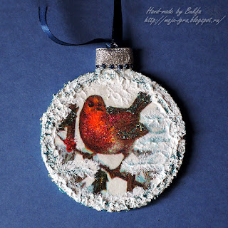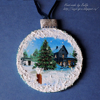 Затем по окружности и на всех "снежных местах" картинок нанесена рельефная паста, в которую добавлена белая акриловая краска и кристальная (хрустальная) паста.