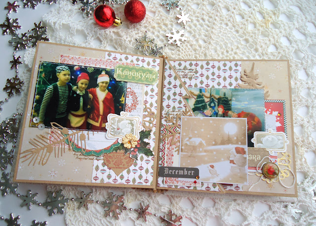 Бумага двух коллекций - набор бумаги "Timeless" от Forever frends (Англия) - золотые, жемчужные, серебристые перламутровые листы и высечки с мишками - задали настроение всему альбому а, набор бумаги Home for Christmas от Fancy Pants - сделал акценты на фото.