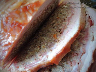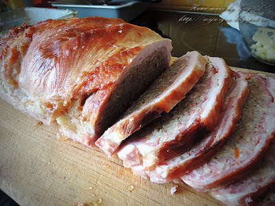 Почему я показываю рулет на разделочной доске, а не сформированной порцией на красивой тарелочке, спросите вы? Да потому, что до тарелок он не дожил и был съеден нашей совсем немаленькой семьёй прямо вот так, с досочки, горячим, обжигающим руки и языки - такой он был вкусным!))) Не до праздничного стола нам тут!)))