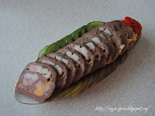 Готовое блюдо охлаждаю, нарезаю вот так (горячим резать не стоит!).
