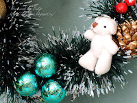 Сверху образовался вот такой зимний букетик, снизу на золотой шишке сидит малышка-медвежонок, на шариках блестит радужный глиттер.