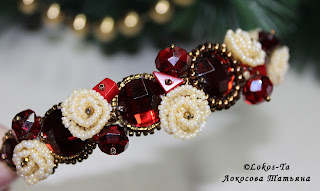 Рубиновый цвет освежают кремовые цветочки-розочки из бисера с бронзовыми серединками.