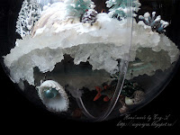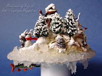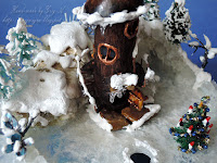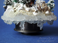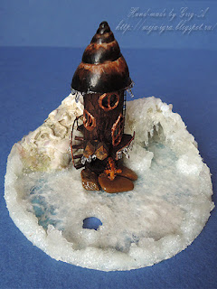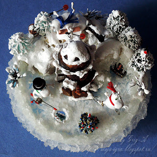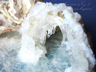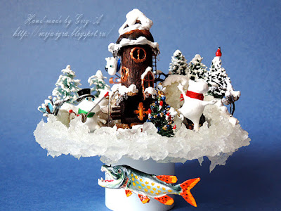 Вот грот со свисающими сверху сосульками. Кстати, основа грота и холма, с которого катится на лыжах мумик, раковины устриц. Снег и лед на них и везде сделан с помощью многих материалов: шпаклевка, рельефная акриловая паста, белая краска, кристальная паста, абсолютно прозрачный (как написано на упаковке) клей-герметик, акриловый водостойкий клей, прозрачный контур.