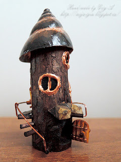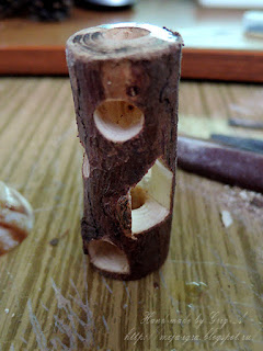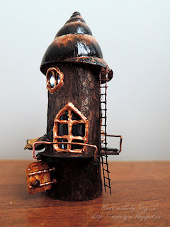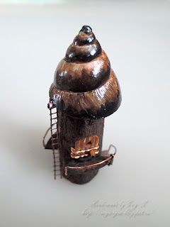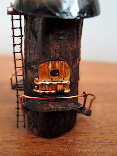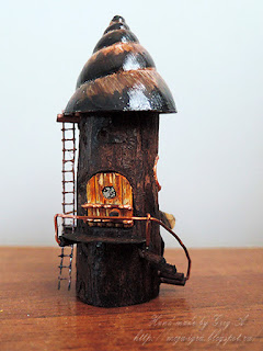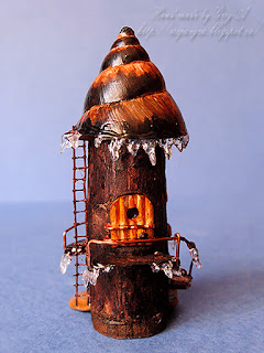Домик сделан из ветки можжевельника, а крыша - кусочек ракушки. Двери в домике открываются, окошки застеклены пластиковой пленкой, лестнички из дерева с проволокой и оконной сетки от комаров.