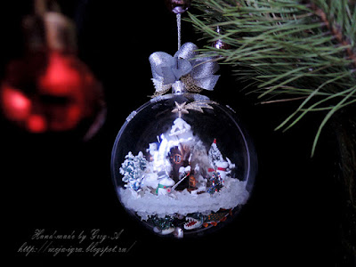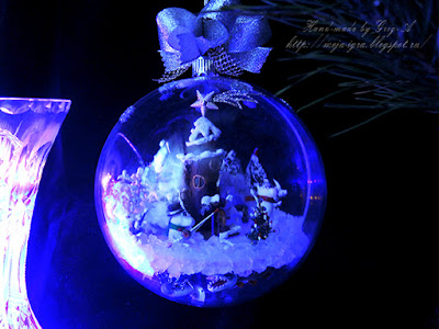 Вот, что получилось в итоге! И все это дело было отправлено в заключение в пластиковый шар, шнурок, бантик, снежинки снаружи... Вот и вся работа!)))
