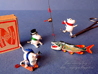 Муми-папа еще без удочки и в шляпе из колпачка от какого-то пузырька и шайбы. Все мумики в шарфиках из мулине и с трогательными хвостиками.