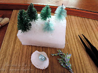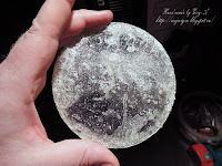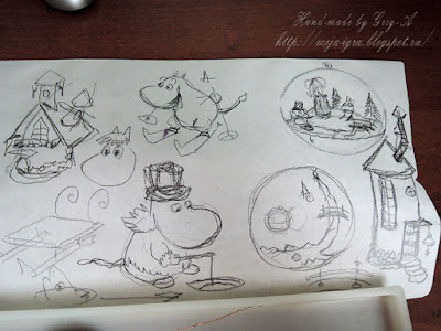 А вот и лед или сама подставка под весь муми-мир. Это вырезанный из прозрачной кукольной коробки диск, на котором сделан морозный узор, имитация льда, при помощи магнезии и пива. Потом на этом льду началось строительство природы и всего остального.