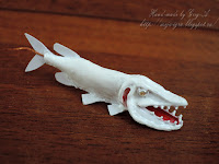 Потом почему-то была сделана щука: нарисована на двух бумажках, вырезана и склеена, как 3D-пазл, доработана акриловыми контурами и покрашена. Вот щуку надо было подвесить в нижней части шара на леске Муми-папиной удочки. Для этого в щуку Игорь, как он объяснил, вставил стальную иглу и прикрепил ее к крючку и проволоке-леске удочки - рыба висит на одной проволочке изо рта.)))
