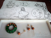 Коньки Фрекен Снорк сделаны из канцелярских скрепок, а лыжи Муми-Тролля из медной пластины. Лыжные палки - те же скрепки и плотной красный полимерной пленки, петли для рук - ниточки.