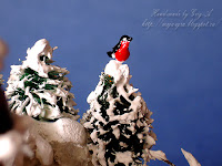 На макушке одной елочки сидит вот такой снегирек. А всего-то - проволочка и акриловые контуры.