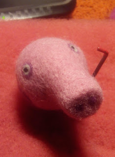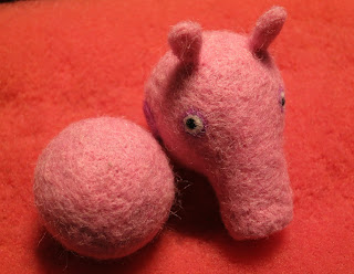 Обратились ко мне в прошлом году с просьбой показать мастер-класс по валянию (этой самой свинки). За примерно часа полтора мы успели соорудить "черновик" головы и пузика, остальное было домашним заданием. Но, так как мы, взрослые, - люди занятые, ко мне вернулись с просьбой довести начатое до конца. Так ко мне в руки попали эти два комочка: